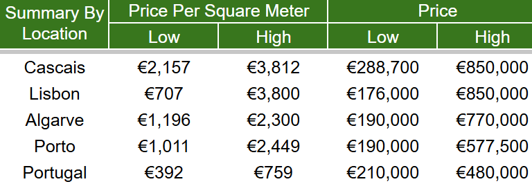 Sorted by Price Per Square Meter (all Portugal Average = β¬1,619)