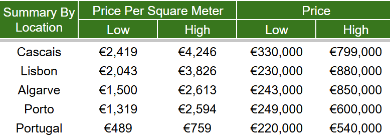 Sorted by Price Per Square Meter (all Portugal Average = β¬1,619)