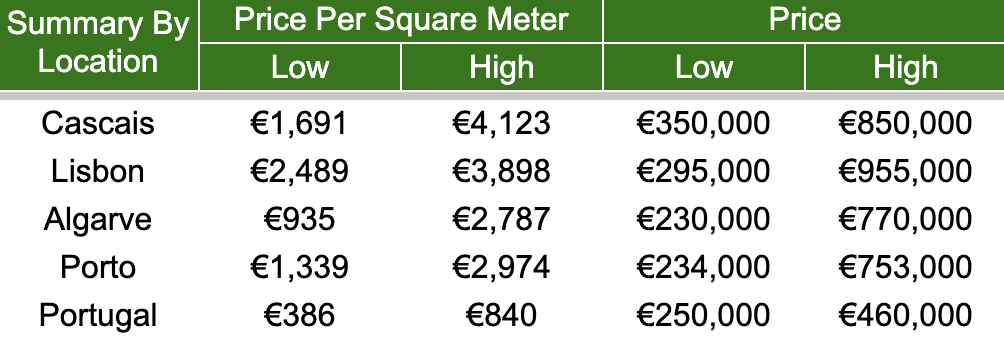 Sorted by Price Per Square Meter (all Portugal Average = β¬1,619)