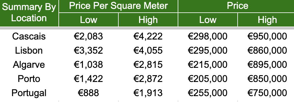 Sorted by Price Per Square Meter (all Portugal Average = β¬1,619)