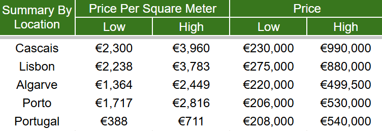 Sorted by Price Per Square Meter (all Portugal Average = โฌ1,619)