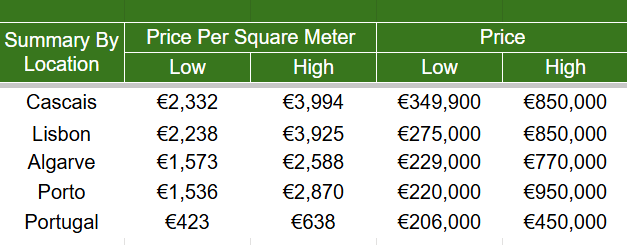Sorted by Price Per Square Meter (all Portugal Average = โฌ1,619)
