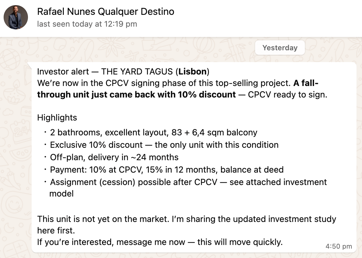 It’s not uncommon that I get a text message from one of our partner agents who has access to a TIME SENSITIVE, but CREDIBLE, VETTED and VIABLE investment opportunity in Portugal. Texts like this one 👇🏽