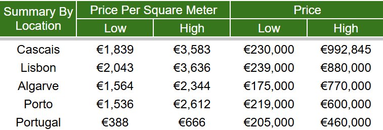 Sorted by Price Per Square Meter (all Portugal Average = โฌ1,619)
