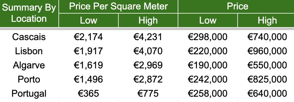 Sorted by Price Per Square Meter (all Portugal Average = β¬1,619)