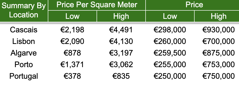 Sorted by Price Per Square Meter (all Portugal Average = β¬1,619)