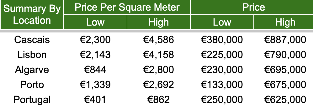 Sorted by Price Per Square Meter (all Portugal Average = β¬1,619)