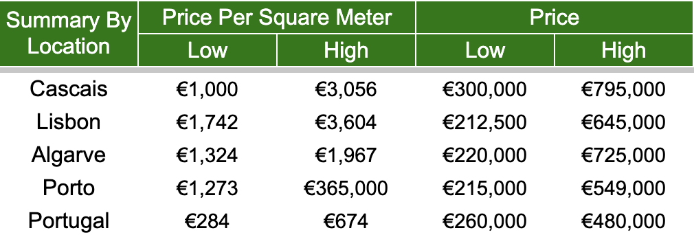 Sorted by Price Per Square Meter (all Portugal Average = β¬1,619)