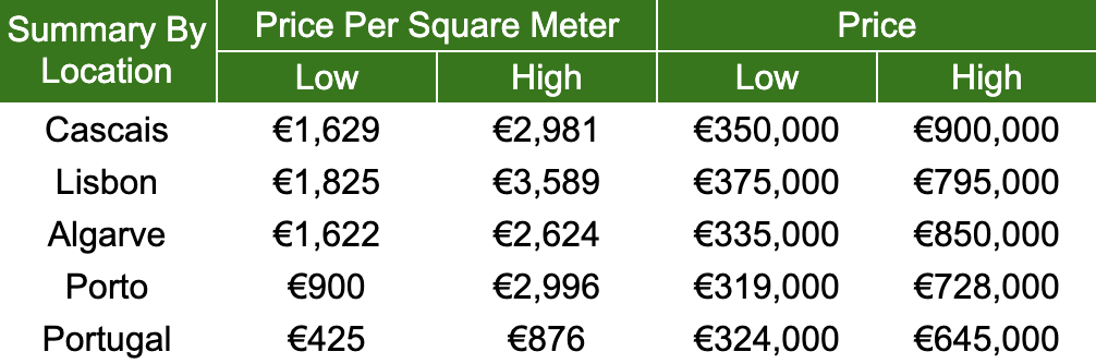 Sorted by Price Per Square Meter (all Portugal Average = €1,619)