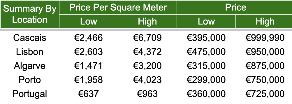 Sorted by Price Per Square Meter (all Portugal Average = β¬1,619)
