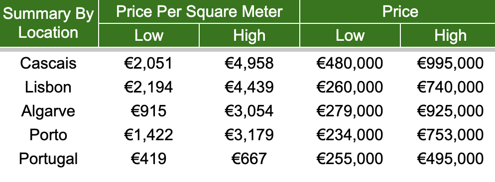 Sorted by Price Per Square Meter (all Portugal Average = β¬1,619)